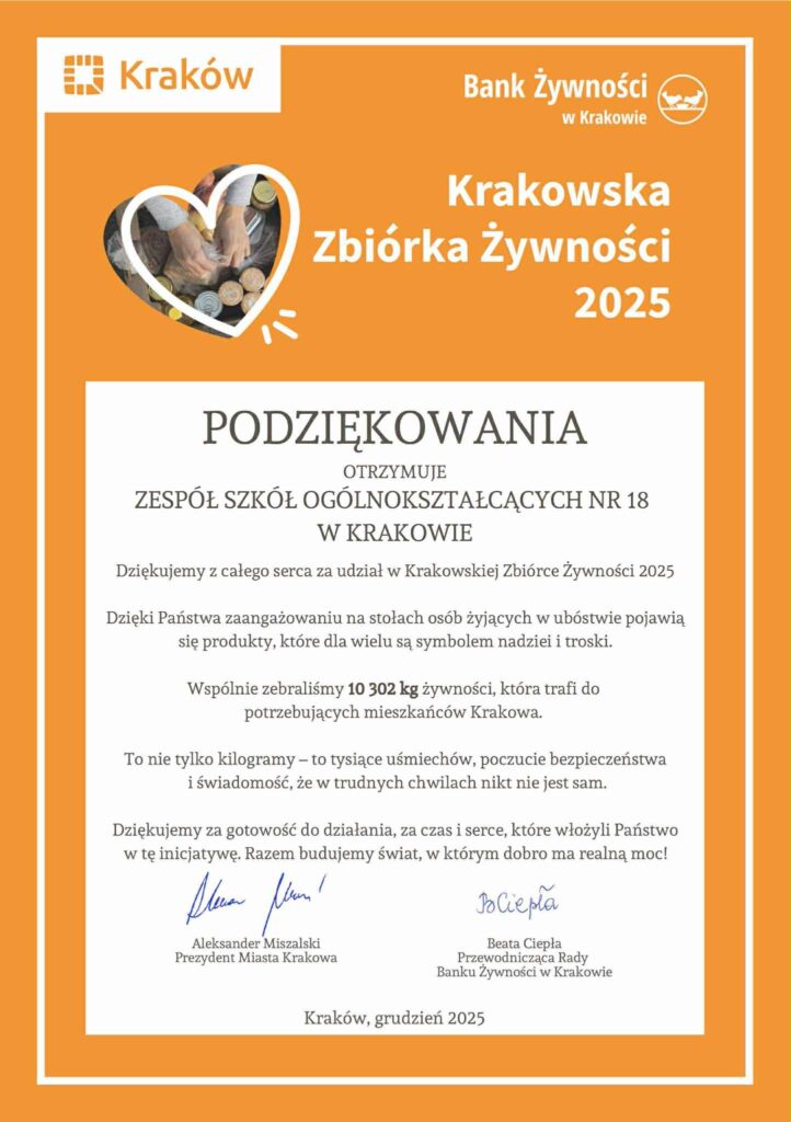 Dzięki ogromnemu zaangażowaniu naszych uczniów, rodziców i całej społeczności szkolnej udało się w grudniu 2025 r. zebrać 97 kg żywności! To imponujący wynik, który realnie wesprze potrzebujące rodziny. Razem po raz kolejny pokazaliśmy, że w Krakowie naprawdę #ŻywimyNadzieję.