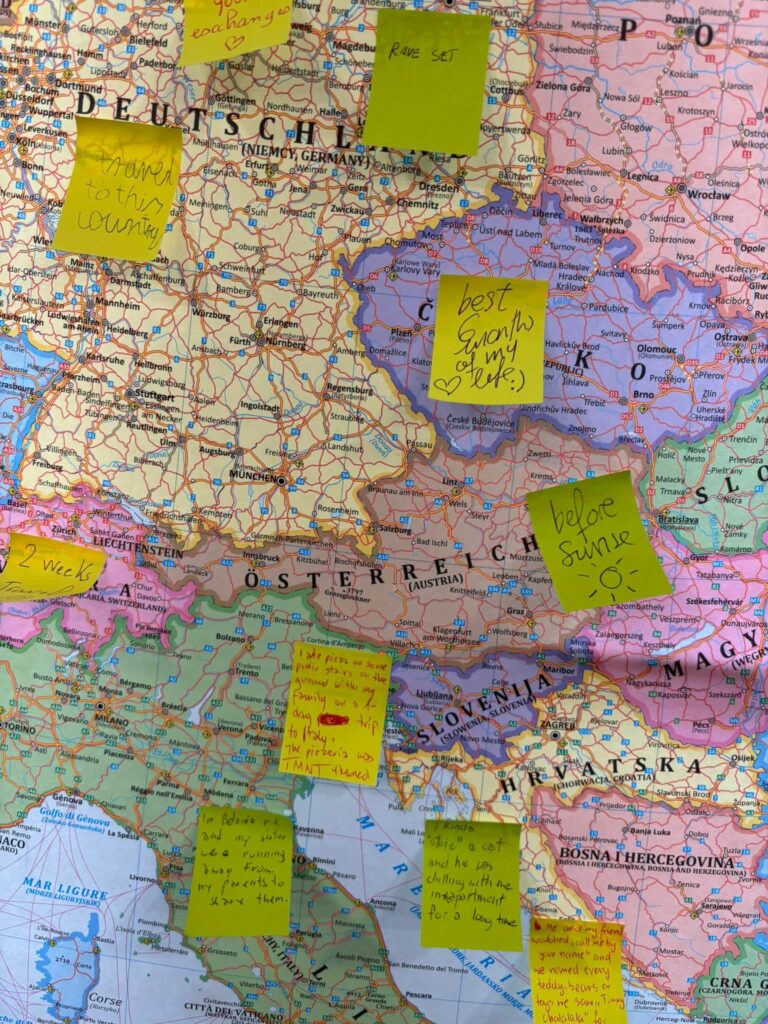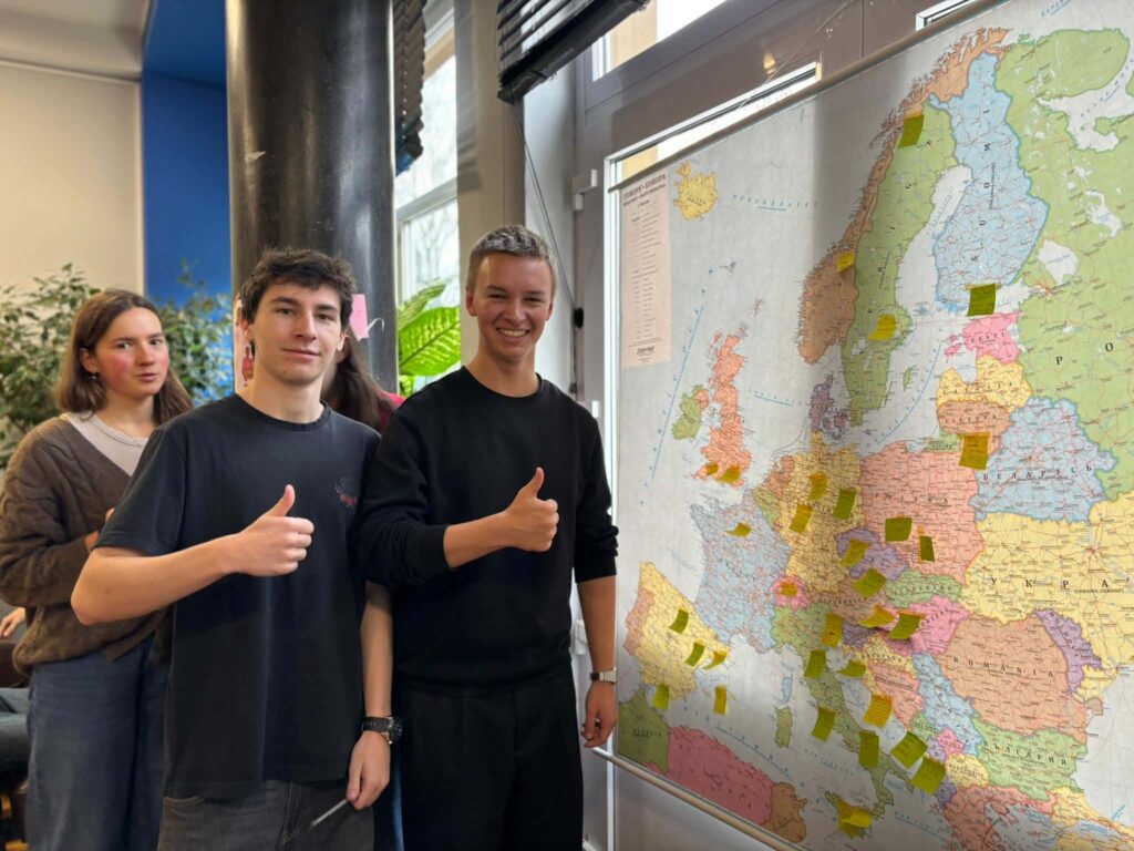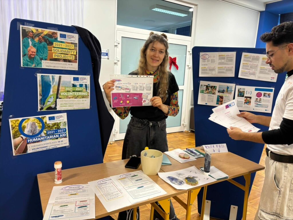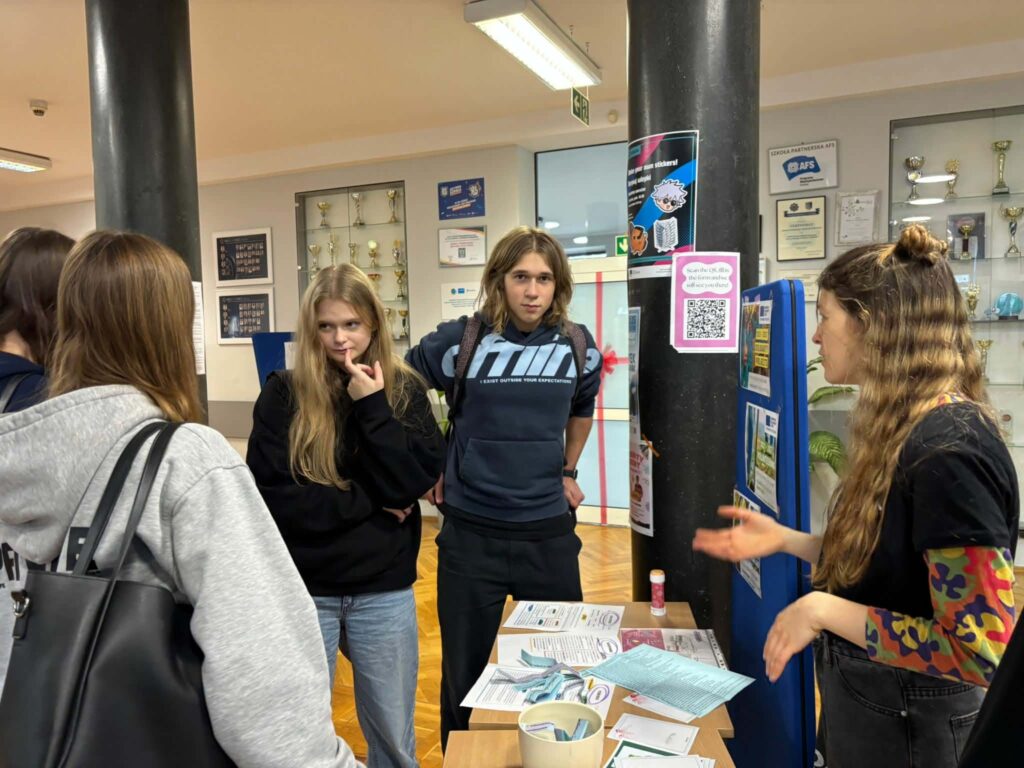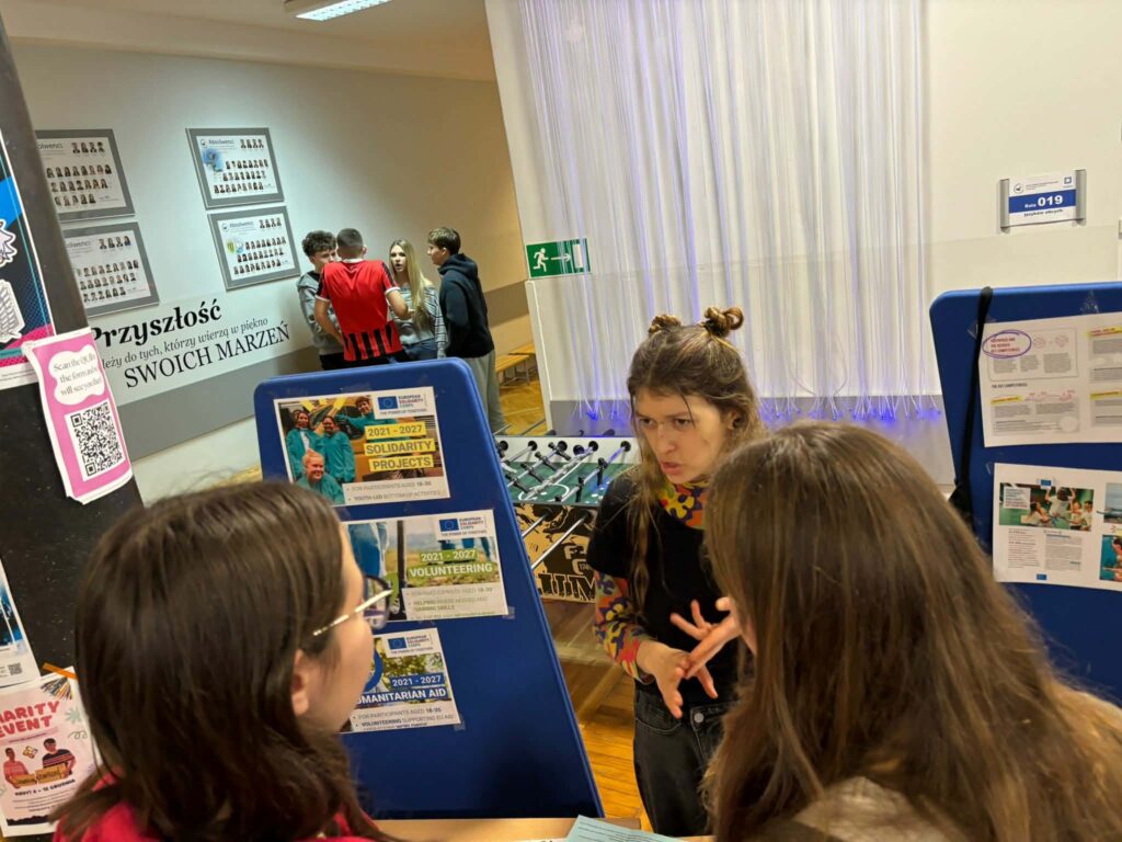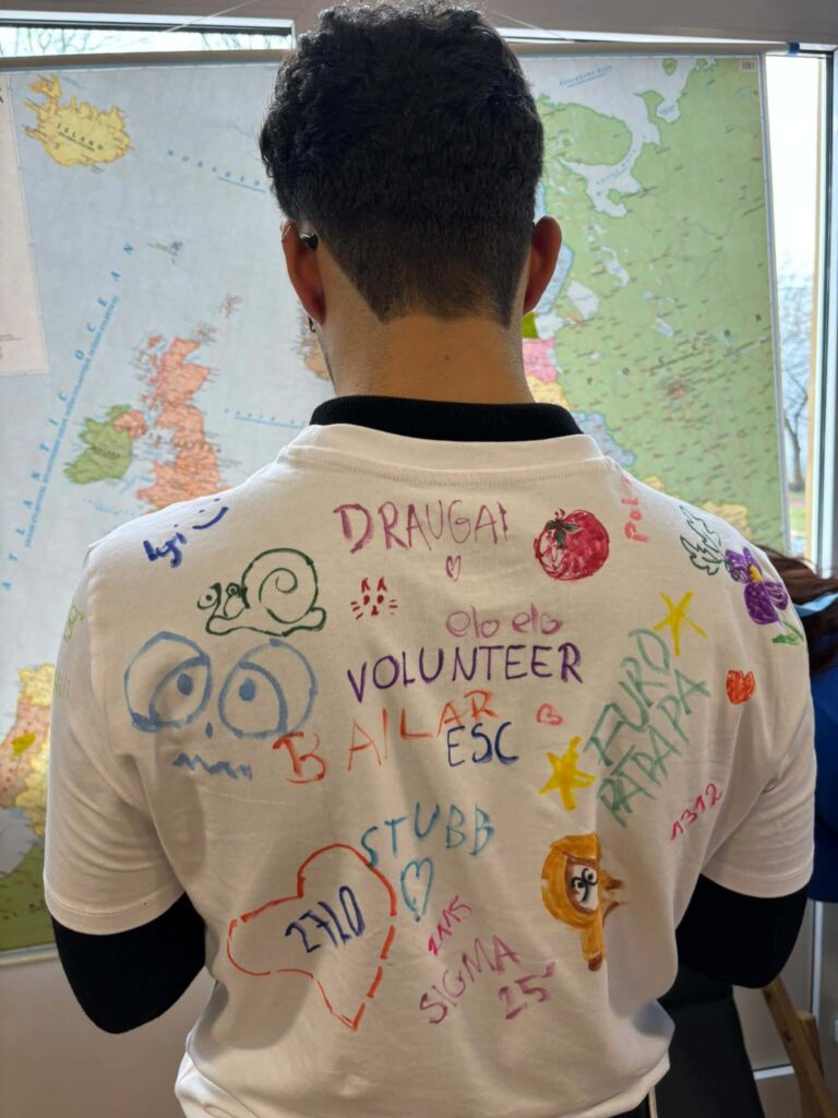 W holu na parterze zorganizowano kilka stanowisk, przy których można było porozmawiać o innych kulturach i zwyczajach, uzyskać odpowiedzi na pytania dotyczące tego, co oznacza bycie wolontariuszem, podzielić się podróżniczymi doświadczeniami na mapie Europy oraz zagrać w podchody odnajdując ważne dla nas słowa – Pomoc, Społeczność, Wolontariat i Solidarność – w różnych językach ukryte w całej szkole. Na drugim piętrze kontynuowaliśmy naukę języków obcych poprzez karaoke, a uczniowie mogli wykazać się swoimi umiejętnościami artystycznymi malując wspólnie mural. Na koniec Guilherme rozdał koszulki, na których każdy mógł coś narysować i w ten sposób przyczynić się do stworzenia wspólnych dzieł sztuki.
