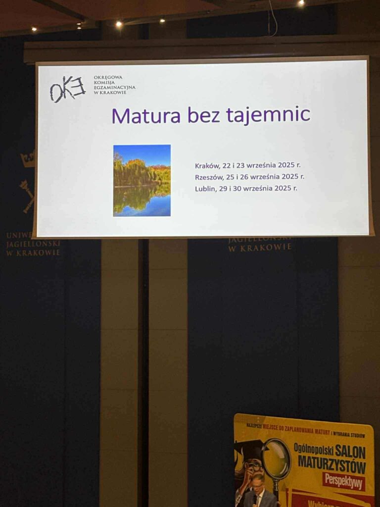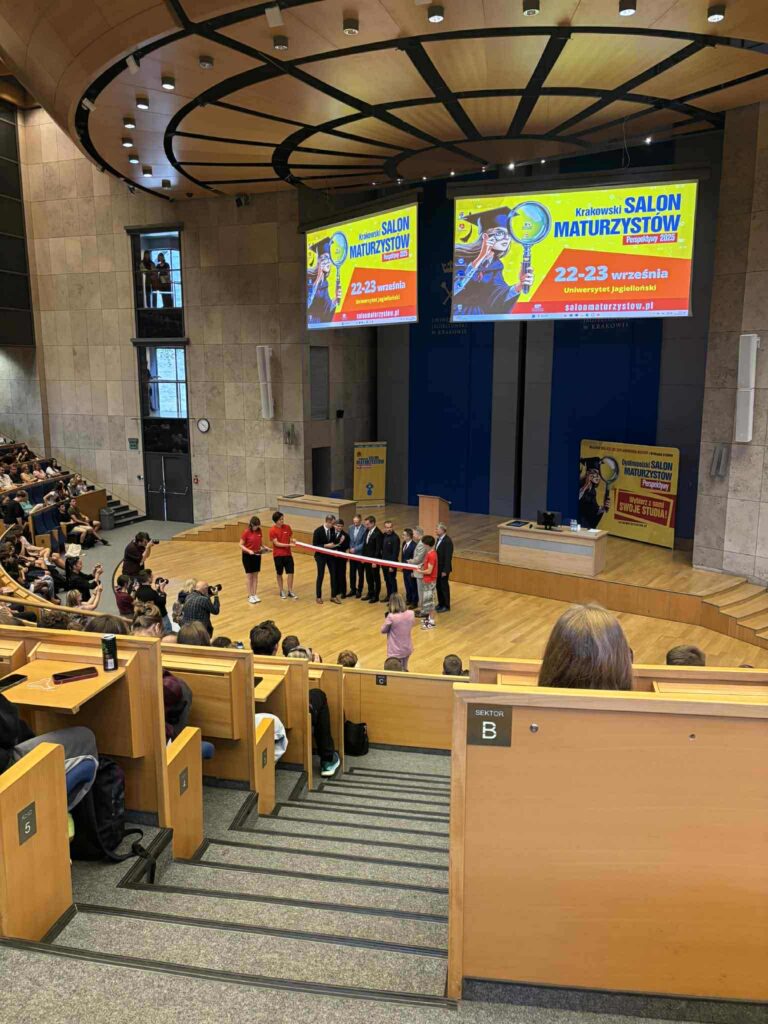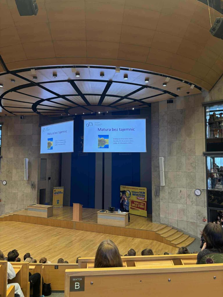 W dniach 22 i 23 września 2025 r. uczniowie klas maturalnych naszego liceum wzięli udział w Krakowskim Salonie Maturzystów 2025, który odbywał się w Auditorium Maximum Uniwersytetu Jagiellońskiego. Podczas wydarzenia młodzież zapoznała się z ofertą uczelni wyższych, a także wysłuchała wykładów dotyczących egzaminu maturalnego. Teraz nic tylko wykorzystać tę wiedzę w praktyce!