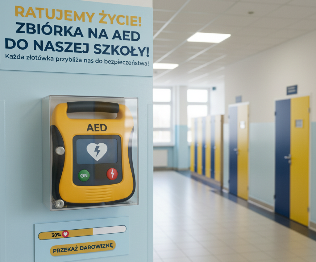 Przez cały grudzień uczniowie klasy 5a SP będą kwestować na zakup szkolnego AED. W czasie lekcji pojawią się z puszkami — prosimy o życzliwość, a prowadzących zajęcia o odrobinę cierpliwości.